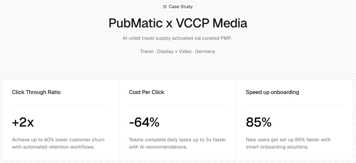 Specificity over scale. Early on, we don't try to boil the ocean - we identify one clear use case for a partner, run a contained pilot, and let the data do the talking. Our travel pilot delivered 2× higher CTR and 64% lower CPC. Those numbers open doors and build trust faster than any deck. We also think hard about aligning on what success looks like before we start, so there's no ambiguity at readout.